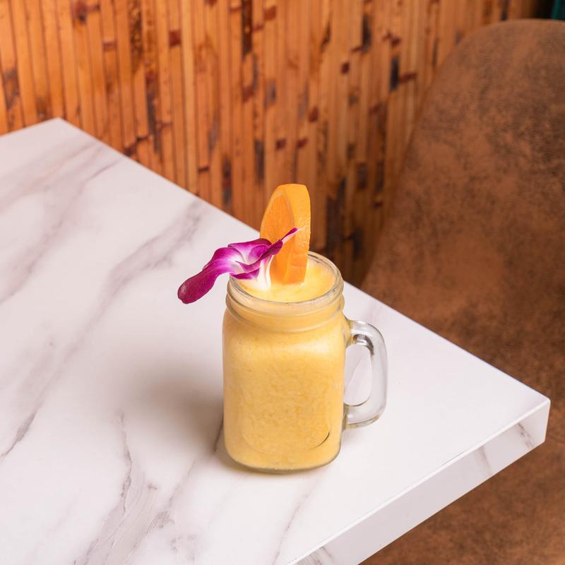 Banana, mango, peach, yogurt, OJ.